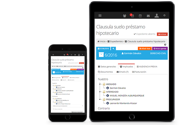 - Implicados: desde este área se pueden seleccionar o dar de alta sin necesidad de salir del expediente todas aquellas personas implicadas en el mismo, como son los interesados, abogados, procuradores, peritos, etc., tanto de nuestra parte como de la contraria.